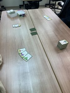 読み手は、当てる人が迷わないようにセリフを工夫しないとペナルティになるため、他のカードと混同されない絶妙な表現を考える必要があります。最初は要領がつかめず時間がかかりましたが、だんだんとテンポが上がり、30分ほどでみんなコツをつかんでいました。
